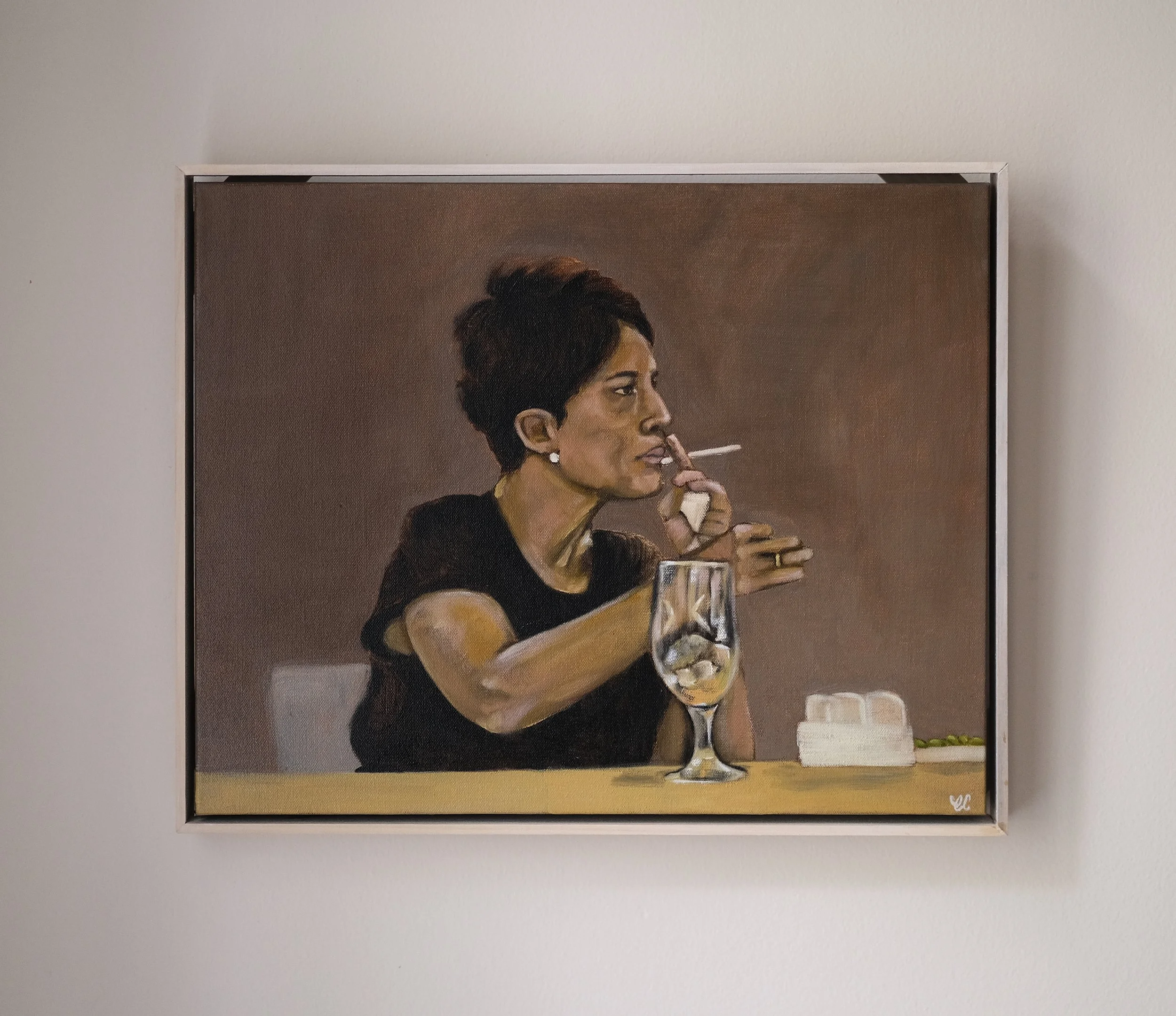 She sits mid thought. Caught between conversation and solitude. A quiet moment shaped by routine, ritual, and the rhythm of the city around her.